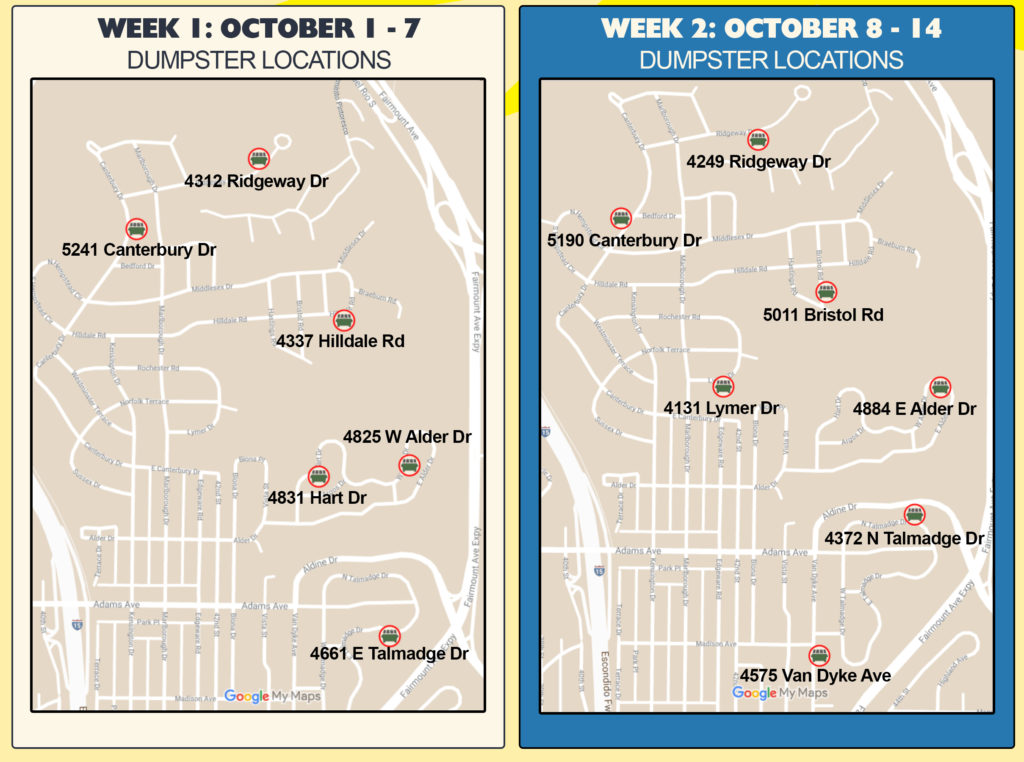 On Thursday, October 7, emptied dumpsters were placed at seven new locations around Kensington. Here are the Week 2 dumpsters: