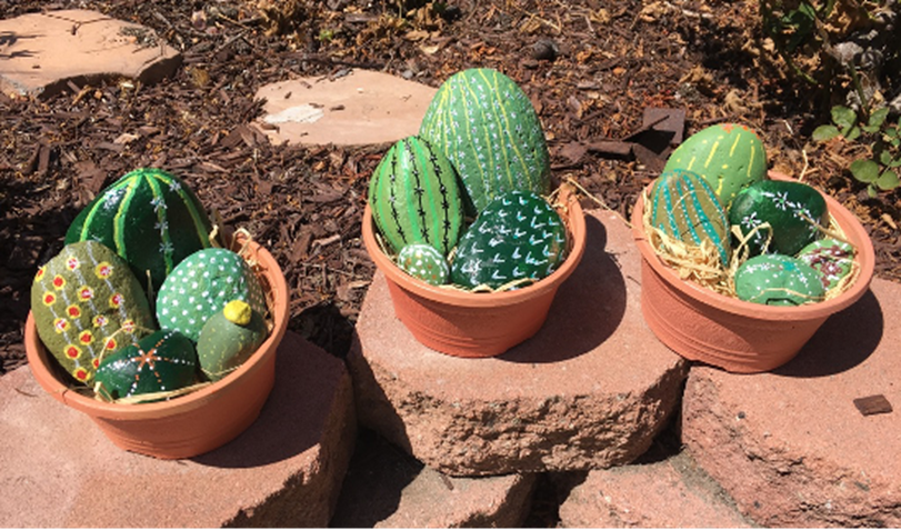 With gravel in pots rather than the raffia pictured here.  We need lots of round, fairly smooth rocks!  Please let us know if you can help!